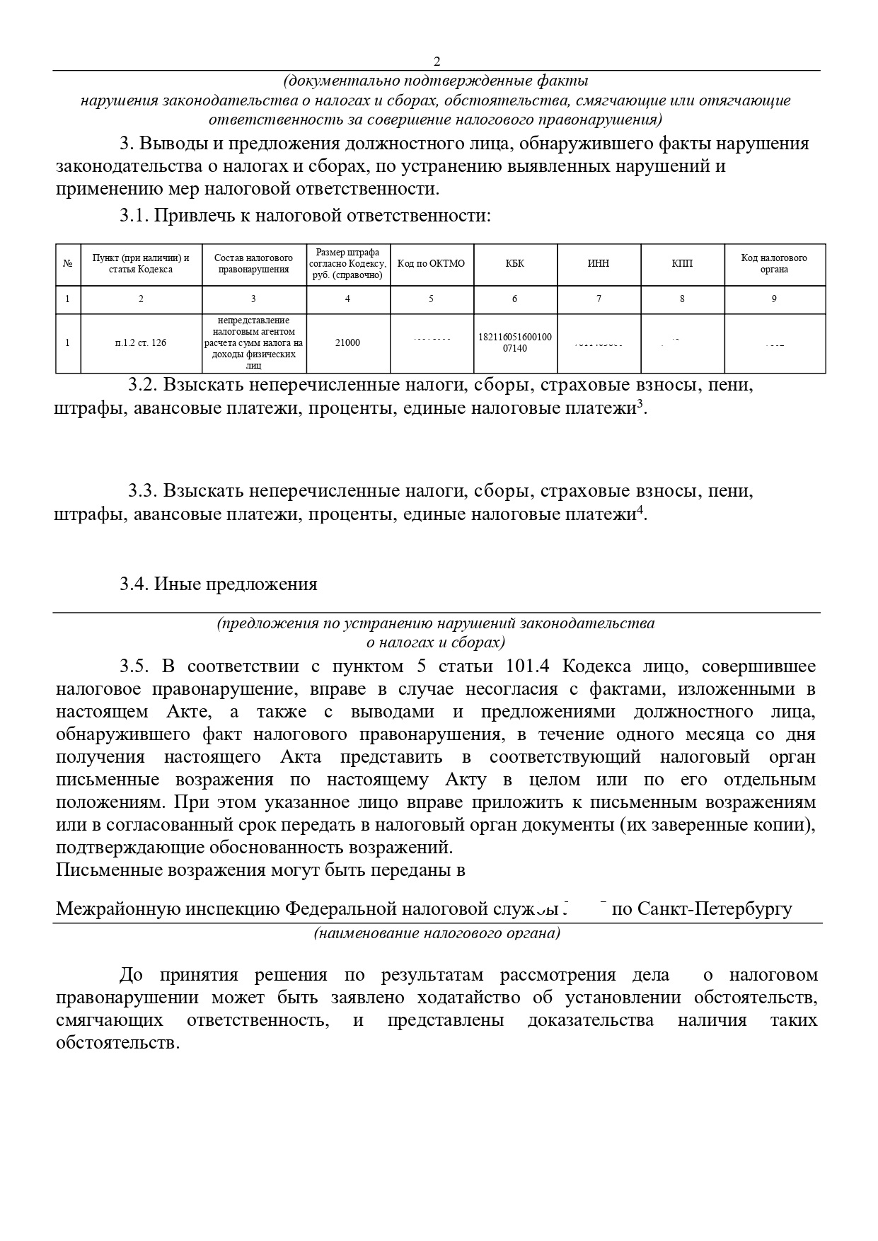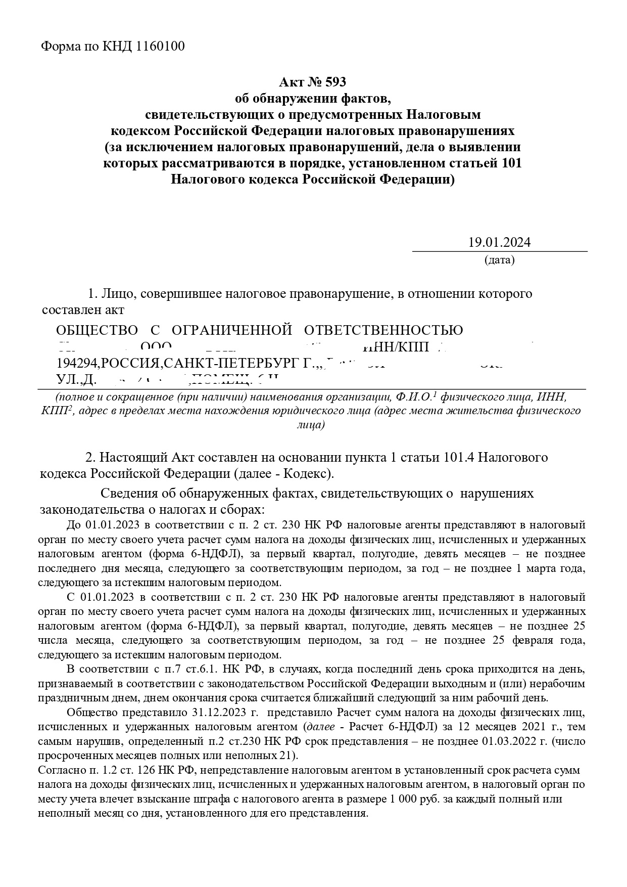 Поиск по форумуОтчетность, санкции13.02.2024, Баранова Екатерина БорисовнаКому адресовано: Центр финансовых экспертизДобрый вечер. У организации в ноябре сменился юр.адрес. За 4квартал мы подали форму 6НДФЛ по «новому» КПП на всю сумму доходов и налога за год. Затем подали исправительные формы 6НДФЛ. По «старому» КПП была подана форма 6НДФЛ (первичная), по «новому» КПП была подана форма 6НДФЛ (корректирующая №1). Суммы доходов и начисленных с них налогов были распределены на две формы 6НДФЛ, одна из которых по «старому» КПП, а вторая по «новому» КПП, т.е. если сложить суммы доходов и налогов по сданным корректировкам, то получим суммы указанные в первоначально поданной «неправильной» 6НДФЛ. Налоговая, провела камеральную проверку, и по форме 6НДФЛ по «старому» КПП (первичная) нас хотят оштрафовать за несвоевременную сдачу отчета. Правомерно ли взыскание? Ведь мы подали отчет на всю сумму доходов и начисленных налогов вовремя, да часть суммы была отнесена не на то КПП, но отчет на всю сумму был сдан вовремя и теперь корректировками мы лишь сумму перераспределяем между КПП. На какие законодательные нормы можно сослаться для подтверждения своей позиции о необоснованности штрафа. Нужно ли ходить в налоговую (нам по ткс прислали уведомление о вызове в налоговые органы для получения акта), и получать акт камеральной проверки лично или можно дождаться, когда его пришлют по ТКС? Если штраф неправомерен, то каков порядок обжалования акта и в дальнейшем решения по нему? В каких законод. нормах прописаны сроки на обжалование? Заранее благодарю за помощь. Приложенные файлы: 2024 02 13 акт_стр1.jpg